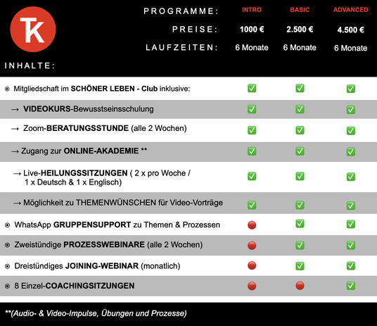 Das INTRO-Programm in BEWUSSTSEINSCHULUNG enthält die Mitgliedschaft im SCHÖNER LEBEN CLUB und seiner Heilungs-Community. Dein Zugang zum Programm kann jederzeit aktiviert werden. Genauso ist es auch mit dem Upgrade auf die ADVANCED - Version (mit individueller & Gruppen-Prozessarbeit).
